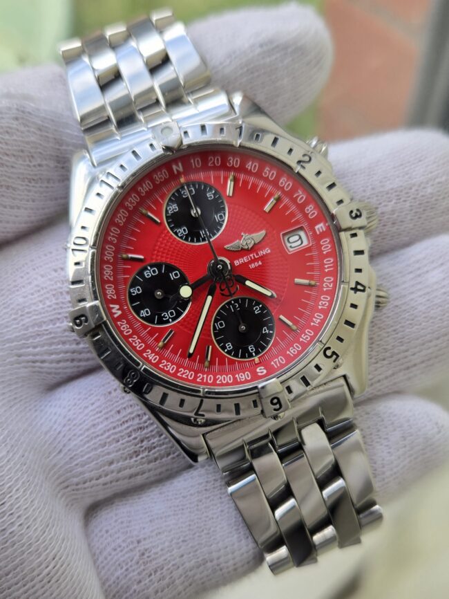 Breiting Chronomat Longitude GMT, Red Dial, Reference A20048, 39mm Stainless Steel, Excellent Condition, Recently Serviced, Keeping Perfect Time, Comes with Certificate of Authenticity