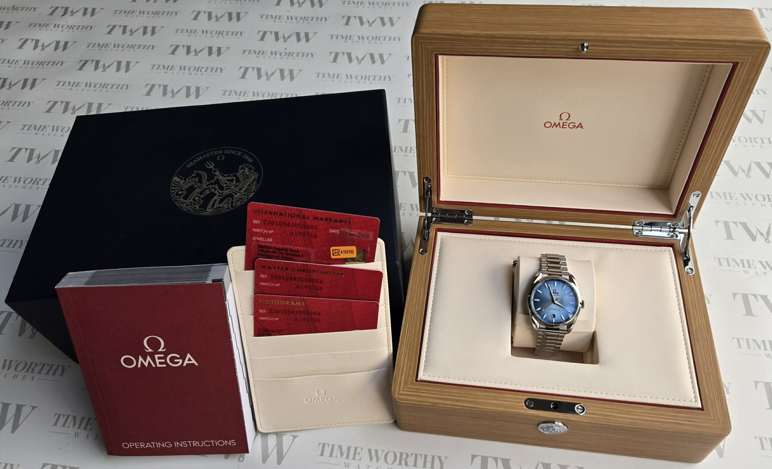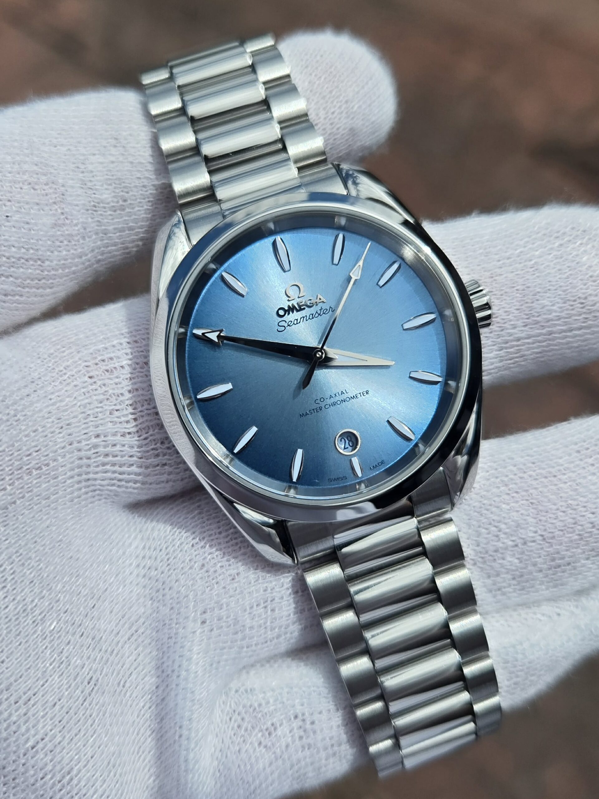 Omega Seamaster 38mm, Summer Blue Index Dial, Stainless Steel Case on Stainless Steel Bracelet, Reference 22010382003004, Year 2023, Full Set Box & Papers, Like New Condition